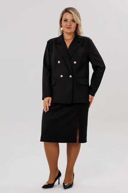 Костюм женский состоит из жакета и юбки. Классический приталенный двубортный жакет с пиджачным воротником на подкладке прямого кроя, имеет удобные функциональные карманы с клапанами, что добавляет практичности. Прекрасным решением в костюме являются позолоченные пуговицы на застежке и рукавах. Юбка без подкладки из стрейчевой ткани, свободного покроя, с аккуратным разрезом на ноге. Пояс юбки на широкой резинке, сбоку молния и петля-пуговица. Ткань хорошо тянется и это позволяет вам комфортно себя чувствовать. Этот костюм – готовый ансамбль не только для офиса, но и для особого мероприятия