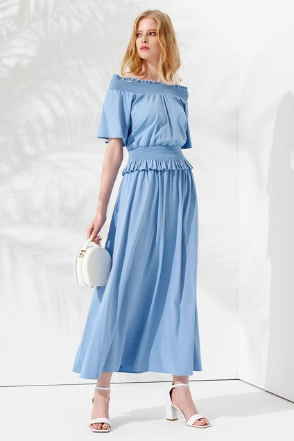 Комплект женский (блузка, юбка) Комплект летний из блузы и длинной юбки решит извечную проблему с гармоничным сочетанием верха и низа. Женский костюм выполнен из вискозы, он легкий и струящийся. В нем можно отправиться на прогулку, в офис, на встречу или торжество. Блузка женская с рукавом-крылышком украшена по линии талии широкой резинкой. Аналогичная резинка проходит и по линии плеч, оголяя их. Блуза и длинная юбка, спадающая мягкими волнами, идеально сочетаются между собой. Вы можете купить костюм с юбкой праздничный в размере 42-48.