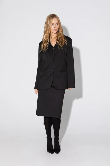 Костюм-двойка из оверсайз жакета с расширенной линией плеч и прямой юбки. Детали: жакет прямого силуэта, пиджачный воротник, перед с прорезными функциональными карманами, однобортная застежка на петли и пуговицы, спинка со средним швом и шлицей, рукава втачные двухшовные, жакет на подкладке. Юбка с высокой посадкой на притачном поясе, застежка на потайную молнию и пуговицу по спинке, шлица по низу юбки, на подкладке.