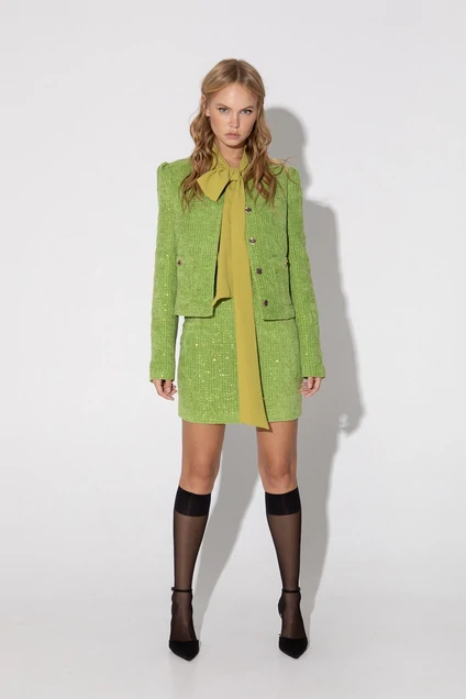 Костюм-двойка из укороченного жакета и мини-юбки с высокой посадкой из фактурной костюмной ткани. Детали: жакет полуприлегающего силуэта, рельефы, круглая горловина, без воротника, рукава втачные со складками по окату, функциональные карманы, застежка на петли и пуговицы, на подкладке. Юбка на притачном поясе, застежка сзади на потайную молнию, юбка на подкладке.