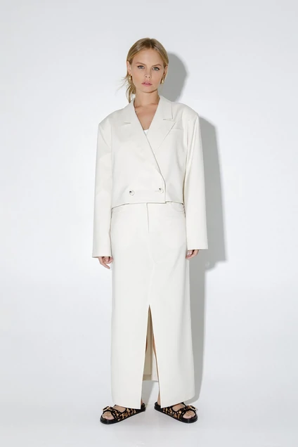 Костюм-двойка из укороченного оверсайз жакета с расширенными плечами и миди-юбки с разрезом. Детали: прямой силуэт, спущенная линия плеча, пиджачный воротник, перед с функциональным нагрудным карманом, застежка двубортная на петли и пуговицы, рукава втачные двухшовные, жакет на подкладке. Юбка асимметричного кроя с высоким разрезом по переду, притачной пояс со шлевками, застежка на молнию и пуговицу, боковые карманы.