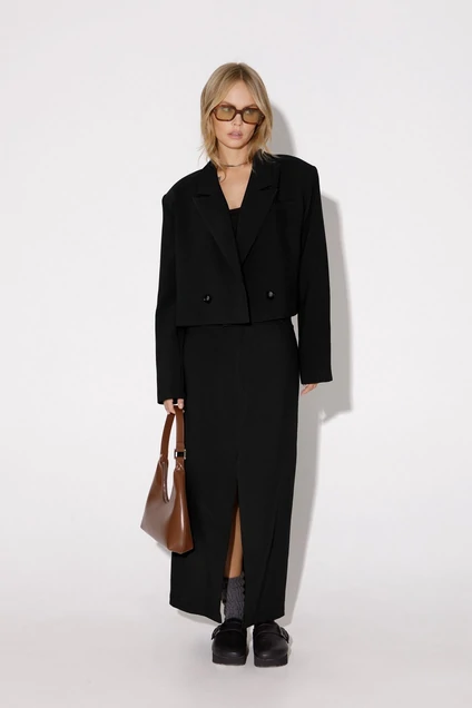 Костюм-двойка из укороченного оверсайз жакета с расширенными плечами и миди-юбки с разрезом. Детали: прямой силуэт, спущенная линия плеча, пиджачный воротник, перед с функциональным нагрудным карманом, застежка двубортная на петли и пуговицы, рукава втачные двухшовные, жакет на подкладке. Юбка асимметричного кроя с высоким разрезом по переду, притачной пояс со шлевками, застежка на молнию и пуговицу, боковые карманы.