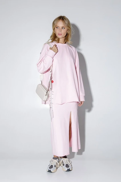 Трикотажный хлопковый костюм из свободного удлиненного свитшота и юбки- макси с разрезом. Детали: свитшот прямого силуэта, рукава покроя реглан, рукава длинные с притачными манжетами, низ переда и спинки с необработанным краем. Юбка с поясом на резинке, рельефные швы, высокий разрез. Костюм из трикотажа футер-двухнитка.