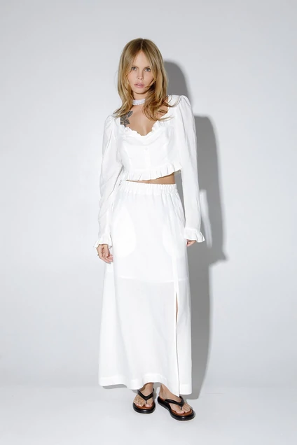 Льняной костюм-двойка из укороченной блузы с декором и макси-юбки с разрезом. Детали: блуза полуприлегающего силуэта, рельефы и талиевые вытачки, глубокий кареобразный вырез переда, длинные рукава с оборками, застежка на потайную молнию в боковом шве, перед блузы на подкладке. Юбка на притачном эластичном поясе, функциональные карманы, подкладка юбки 100% вискоза. Длина блузы с оборкой около 37,5 см в размерах 40-46 и около 42 см в размерах 48-52, длина рукава с оборкой около 64 см. Длина юбки по боковому шву с поясом около 94 см