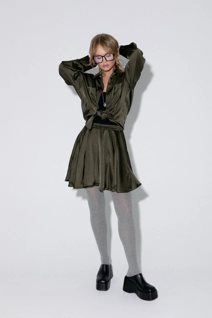 Костюм-двойка из свободной рубашки и мини-юбки из атласной ткани с крэш-эффектом.