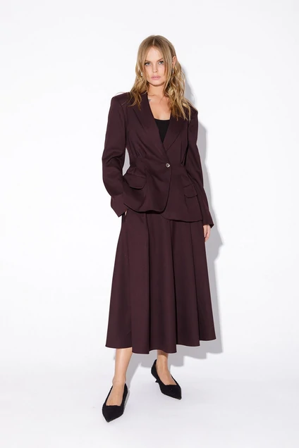 Текстильный костюм-двойка из укороченного приталенного жакета со складками и миди-юбки.