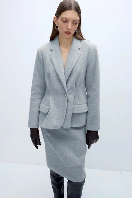 Костюм-двойка из укороченного приталенного жакета со складками и юбки-карандаш из пушистой ткани.