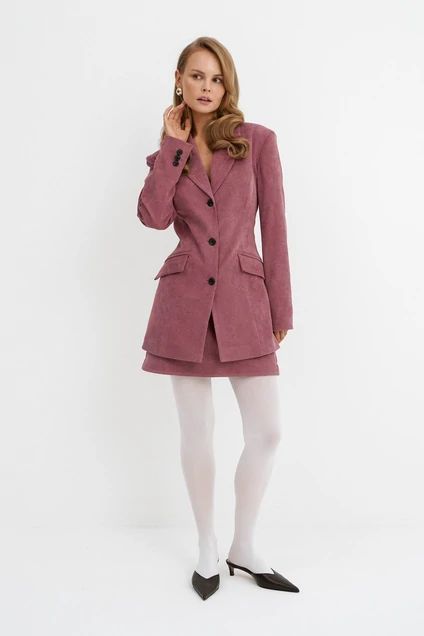 Текстильный костюм-двойка из удлиненного приталенного жакета и мини-юбки.
