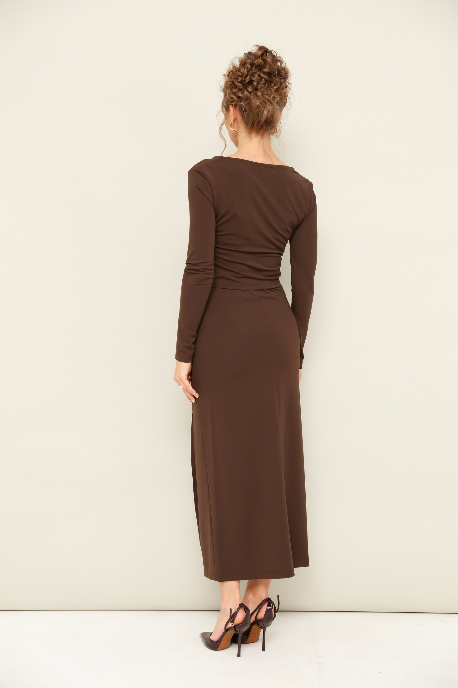 Комплект состоит из топа и юбки, выполнен из качественного бифлекса, эластичного, приятного к телу. Юбка с глубоким вырезом спереди, с кулисой, регулирующая уровнь натяжения и длина изделия. Топ также с кулисой, длину которого можно регулировать и может получиться полноценный джемпер, прикрывающий живот.