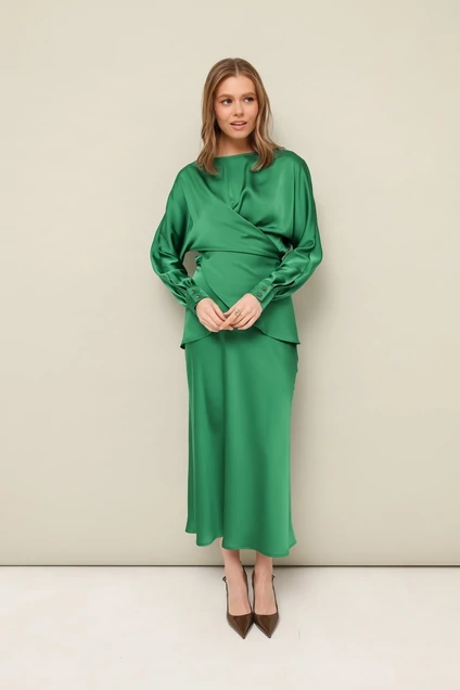 Элегантный 2-предментный комплект, состоящий из блузки и юбки, выполненный из струящейся ткани с деликатным блеском. Блузка прямого кроя с акцентом на талии. Вырез горловины-лодочка. Рукава цельновыкроеные с манжетами с застежкой на петли и пуговицы. По переду обработан разрез с завязками для фиксации половинок переда на спинке. Низ переда фигурный, спинка со средним швом и прямым низом, в боковых швах высокие разрезы. Юбка с кроем «по косой» в длине миди, пояс на обтачке, застежка в боковом шве на потайную тесьму молнию.
