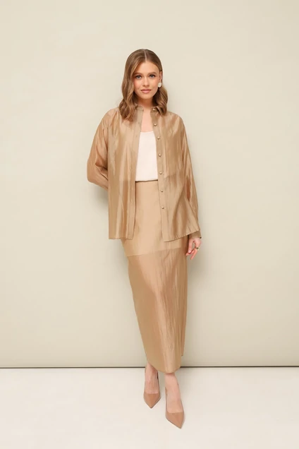 Элегантный 3-предментный комплект, состоящий из топа, блузки и юбки. Топ полуприлегающего силуэта, выполнен из струящейся ткани с матовым блеском. Бретели регулируются по длине. Блузка и юбка, выполнены из вискозного полотна. Блузка прямого кроя, горловина с рубашечным воротником на отрезной стойке, центральная застежка на петли и обтяжные пуговицы. Рукава втачные с манжетами с застежкой на пуговицы. В боковых швах обработаны разрезы. Спинка с отрезной кокеткой и встречной складкой. Юбка на подкладке в длине миди. Притачной пояс с частичной резинкой для регуляции по талии. Застежка в среднем шве по спинке на пуговицу и потайную молнию. Для удобства движения сзади обработана шлица. В комплекте прилагается пояс основной ткани.