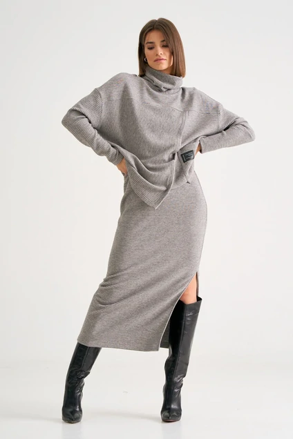 Костюм: джемпер+юбка. Джемпер свободного силуэта, со спущенной линией плеча. Полочка и спинка с ассиметрией. Слева по полочке накладной карман. Воротник стойка.