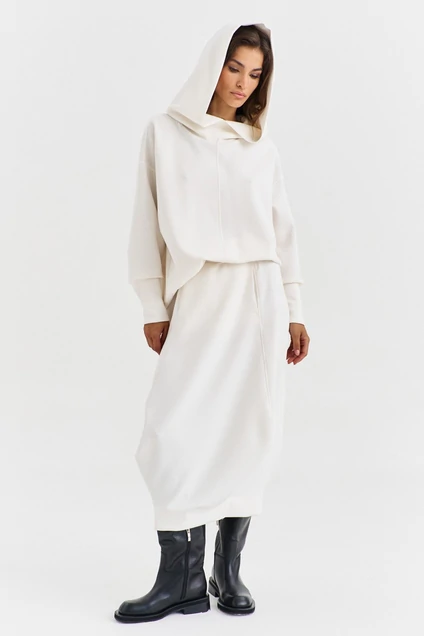 Костюм, состоящий из худи и юбки. Худи свободного кроя, длиной до бедер, с неровной линией низа (по спинке удлинен). По переду центральный шов и притачная планка по низу. Боковые швы перенесены на перед. По горловине объемный капюшон с вытачкой по спинке и центральным швом по переду. Линия плеча спущена, рукава длинные, одношовные втачные, с высокой притачной манжетой по низу. Юбка длиной до середины икры, на притачном поясе с резинкой. Юбка состоит из четырех фигурных клиньев. Центральный клин заднего и переднего полотнища, по низу, с притачной планкой. По боковым клиньям вытачка по низу. По переду обработаны карманы в швах.