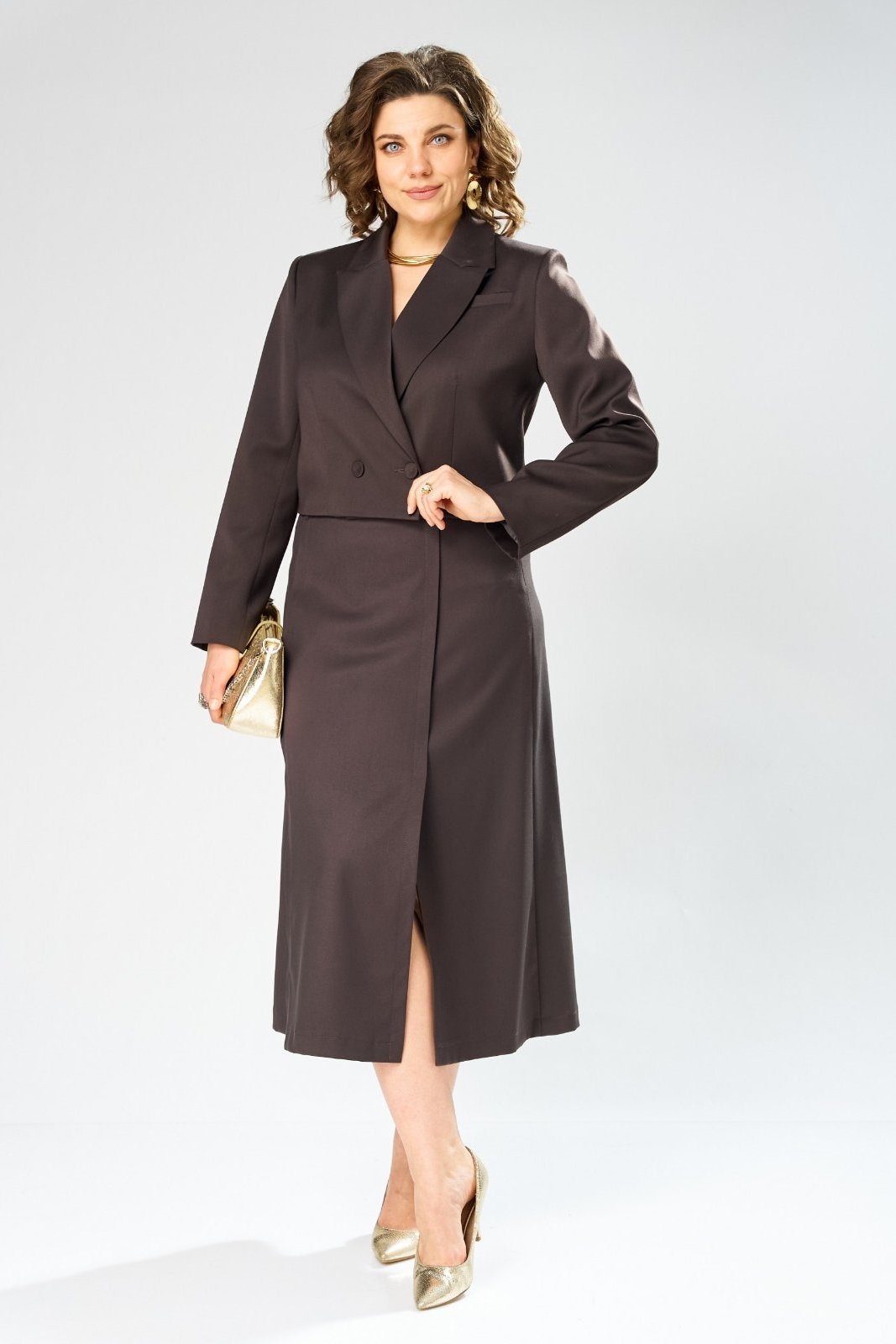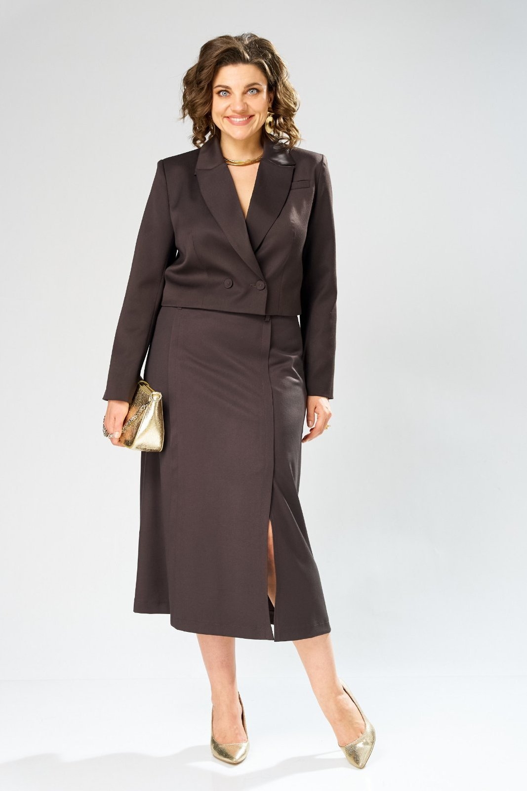 Костюм с юбкой 1013 шоколад Rishelie идеально подходит для создания классического образа. Коллекция бренда Rishelie выполнена из ткани, содержащей 70% полиэстера, 25% вискозы и 5% эластана, обеспечивающей комфорт и легкость носки. Жакет имеет прямой укороченный силуэт с подкладкой, талиевыми вытачками и смещенной застежкой на петли-пуговицы. Длинные втачные рукава добавляют формальности образу. Юбка с шестью клиньями и разрезом на подкладке акцентирует внимание на женственности. Съемный плетеный пояс завершает набор. Шоколадный цвет костюма делает его отличным выбором для осенне-зимнего сезона и подходит для офисного стиля. Это универсальная вещь, которая подчеркнет ваш статус и вкус.
