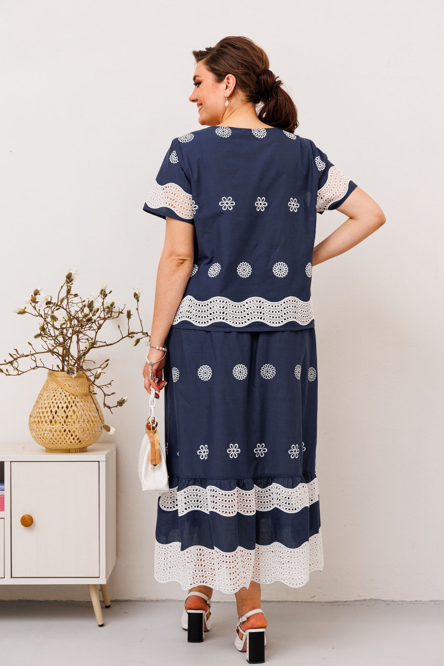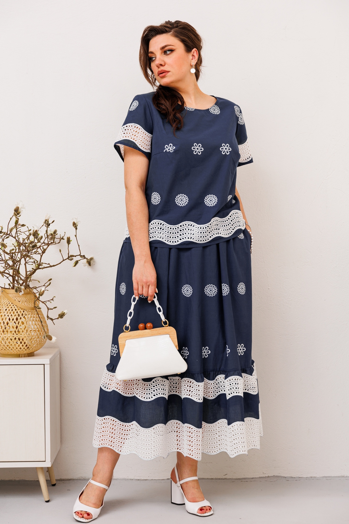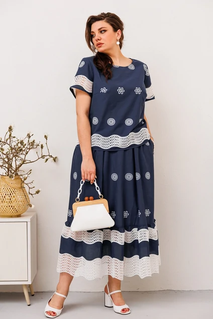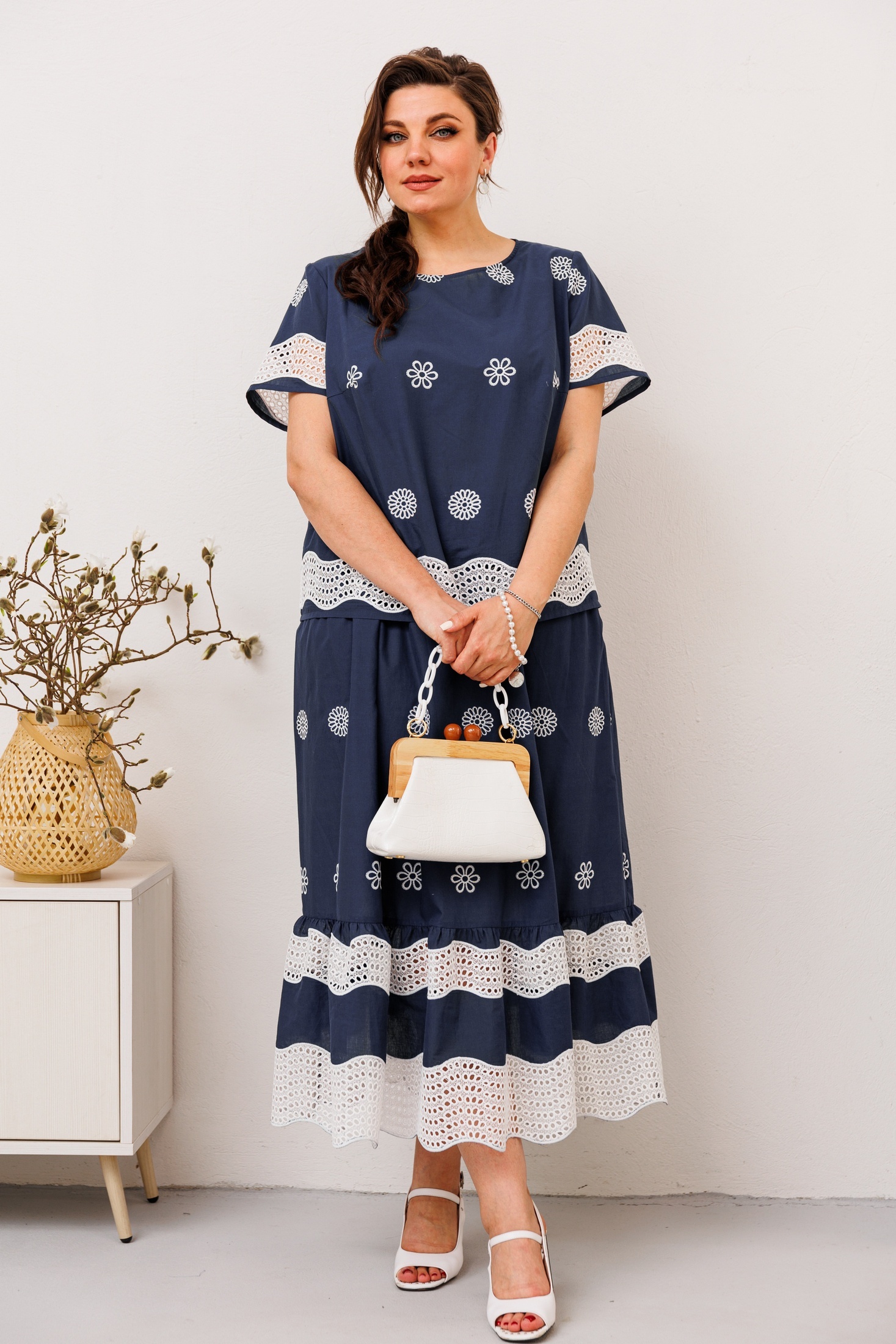 Костюм с юбкой 2-2676 Romanovich style станет незаменимой частью вашего гардероба. Коллекция бренда Romanovich style предлагает стильное решение для повседневной носки. Костюм состоит из блузки и юбки, выполненных из 100% хлопка, что обеспечивает комфорт и воздухопроницаемость. Блузка прямого силуэта с короткими рукавами и круглой горловиной дополнена плечевыми накладками, а юбка расширена к низу и украшена притачным воланом. Контрастные принты и орнаменты добавляют оригинальности. Длина спинки блузки составляет 55 см, а длина юбки — 89 см, что делает костюм идеальным для весенне-летнего сезона. Тёмно-синий цвет с белыми деталями создаёт элегантный и свежий образ для вашего повседневного гардероба.