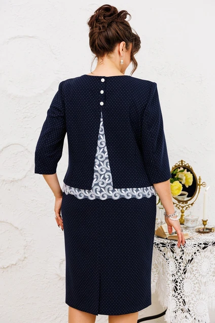Костюм женский предназначен для повседневной носки. Костюм женский 2-х предметный блузон и юбка. Блузон женский полу прилегающего силуэта до линии бёдер. Перед с V-образный декоративной вставкой, с 2-мя рельефами выходящими из плечевых швов, с 2-мя настрочными листочками, декорированными пришивными пуговицами. Спинка со средним швом, с треугольной декоративной вставкой в среднем шве, с 2-мя таллиевыми вытачками. Низ блузона и вставка спинки декорированы притачным кружевом. Горловина фигурная, обточная, без воротника. Застёжка на планках спинки на 3-и обмётанные петли и 3-и пришивные пуговицы. Рукав втачной, 2-х шовный1, длиной 3/4. Блузон с плечевыми накладками. Юбка "карандаш", длиной за колено. Переднее полотнище цельнокроеное. Заднее полотнище с 2-мя таллиевыми вытачками, средним швом, заканчивающимся шлицей. Юбка с притачным поясом, собранным на эластичную тесьму. Юбка на подкладке. Длина юбки по боковому срезу 66 см. Длина спинки блузона 54 см, длина рукава 43 см.