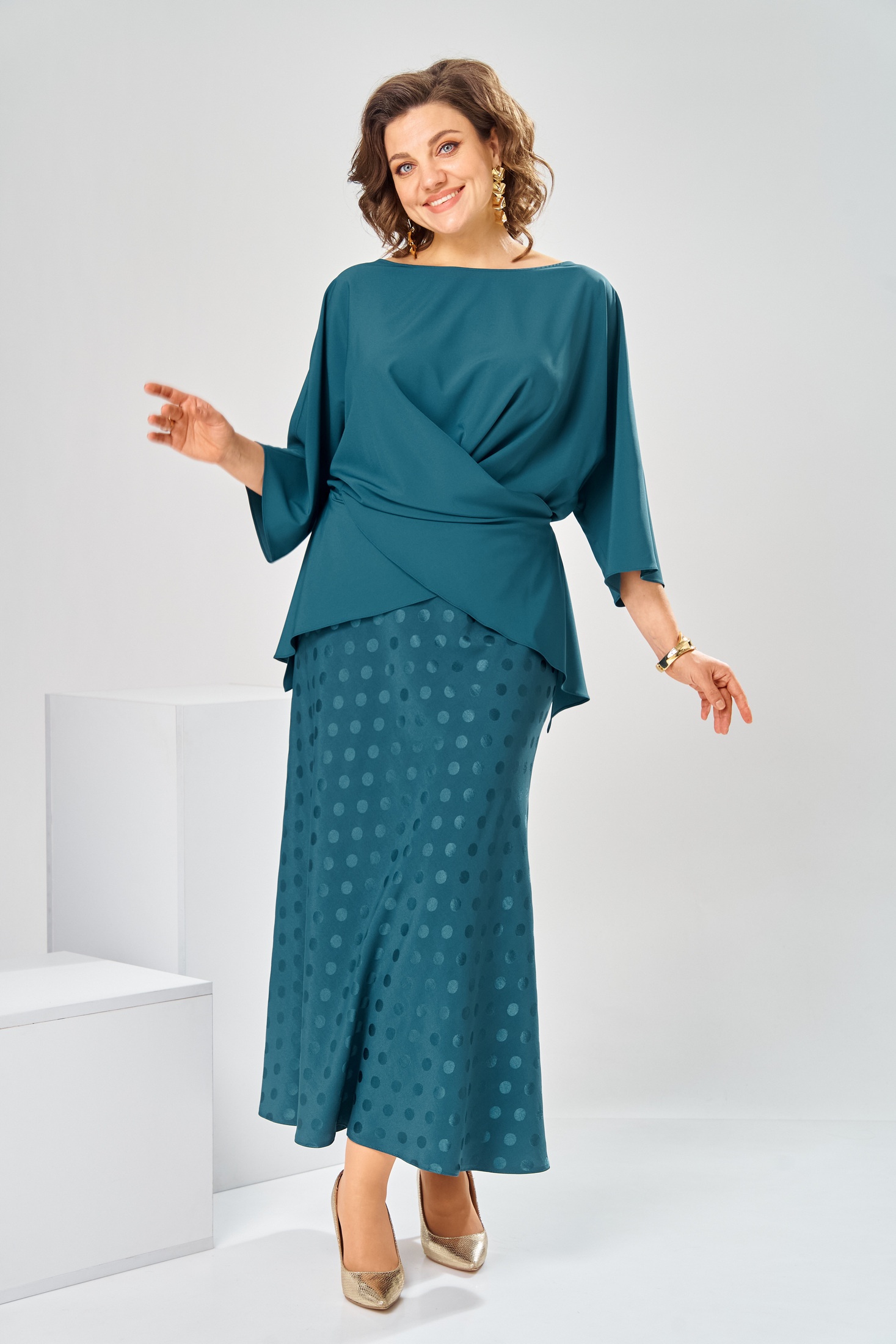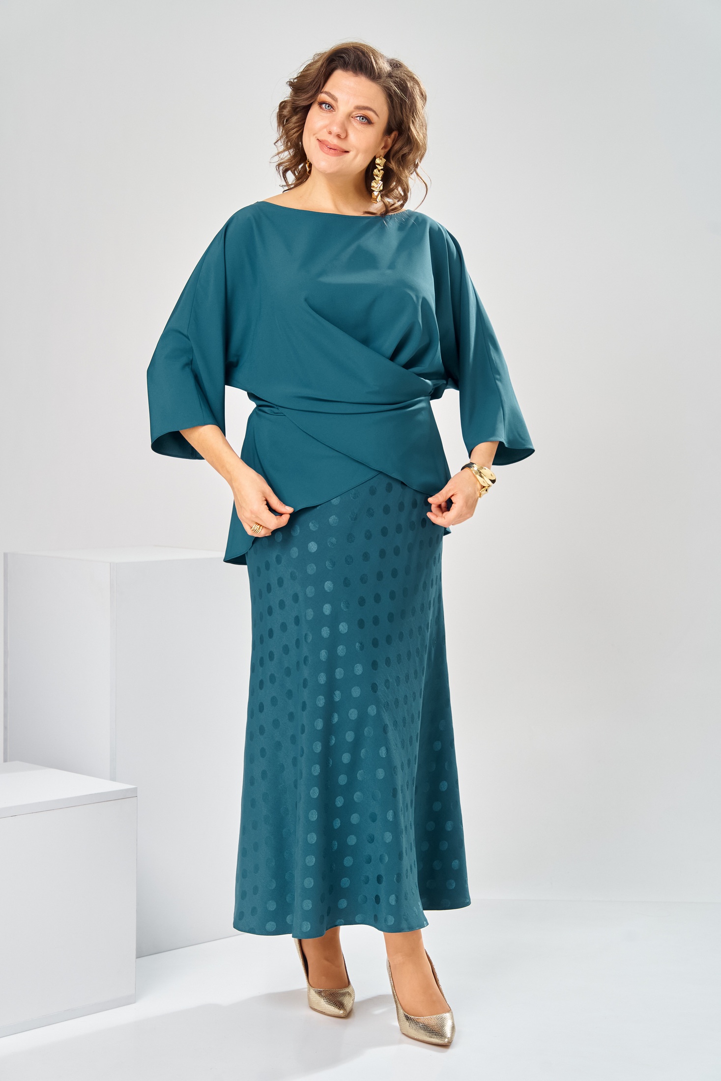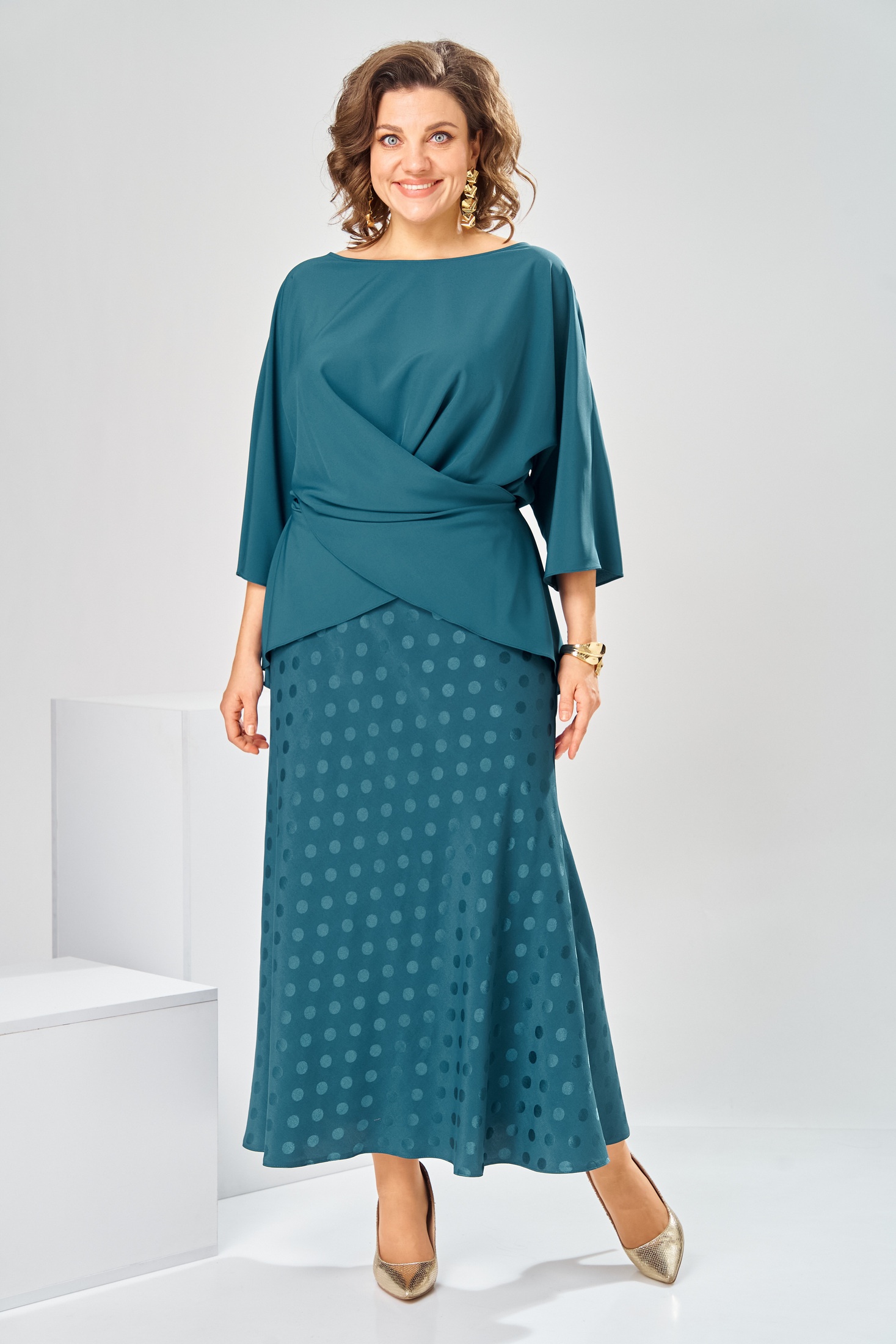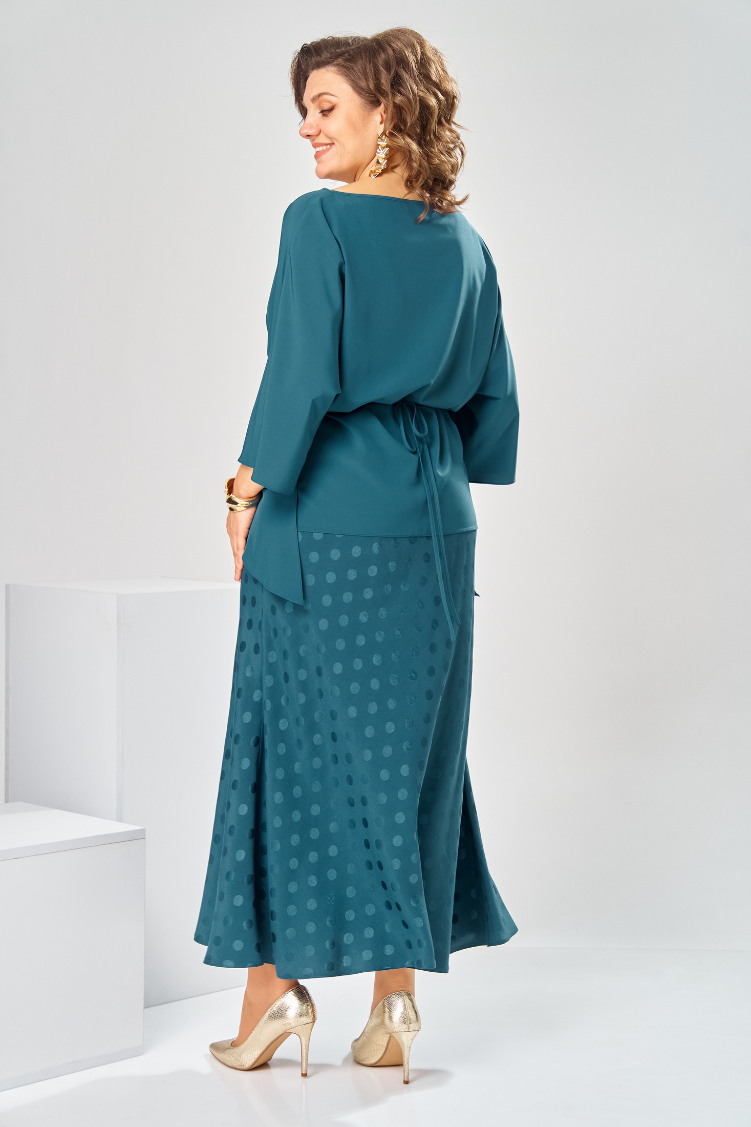 Костюм с юбкой 2-2903 морская волна Romanovich style представит вашу индивидуальность в любой обстановке. Коллекция бренда Romanovich style создана для женщин, которые ценят стиль и комфорт. Костюм выполнен из качественного полиэстера и вискозы, что обеспечивает приятные тактильные ощущения и лёгкость в уходе. Прямой силуэт блузки с цельнокроеной баской и округлой горловиной 'лодочка' придаёт образу женственность и изящество. Юбка с эластичной тесьмой адаптируется к фигуре, длиной 88 см. Яркий цвет морской волны и рисунок в горошек делают костюм отличным выбором для повседневного и нарядного образа в осенне-весенний период. Длина юбки по боковому шву 88 см. Длина спинки блузки 65 см, ширина рукава внизу 21 см.