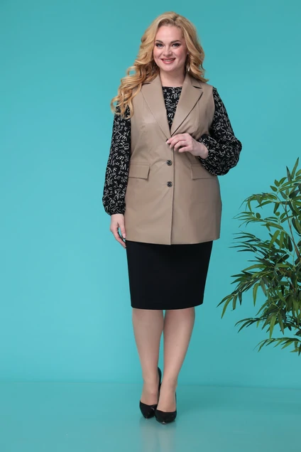 Комплект женский трех предметный: жилет, блузка и юбка предназначен для повседневной носки. Жилет полуприлегающего силуэта, длиной ниже линии бедер на 12см. Перед с двумя отрезными бочками, выходящими из плечевых швов, проходящими через центр груди и на уровне линии талии уходящих в боковые швы. В швах соединения бочков с передом обработаны карманы с настрочными прямоугольными клапанами. Спинка со средним швом и двумя отрезными бочками. Горловина с V-образным вырезом с втачным воротником пиджачного типа с отложным лацканом. Застежка центральная бортовая на 3 пришивные пуговицы. Проймы обтачные. Жилет на подкладке. Блузка женская прямого силуэта, длиной ниже линии бедер на 8см. Перед с двумя нагрудными вытачками. Спинка цельнокроенная. Горловина круглая, без воротника, на спинке с разреом-капельнка и фиксирующимся на одну пришивную пуговицу. Горловина и разрез спинки обработаны косой бейкой. Рукав втачной, одно шовный, длинный. Низ рукава с легкой сборкой и разрезом -капелька с застёжкой на одну пришивную пуговицу. Юбка слегка заужена к низу, длиной за колено. Переднее полотнище с карманами в боковых швах. Заднее полотнище с двумя талиевыми вытачками и средним швом, заканчивающимся шлицей. Юбка с притачным поясом, собранным на эластичную тесьму, закреплённую отделочной строчкой. Юбка на подкладке. Длина жилета 76см. Длина юбки 63см. Длина блузки 59см. Длина рукава 59см