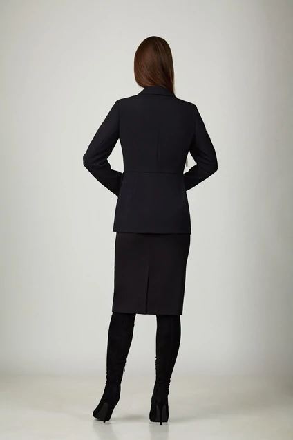 Комплект женский, состоящий из жакета и юбки, выполнен из стрейчевой костюмной ткани на подкладке. Жакет полуприталенного силуэта с рельефами по переду и спинке, отрезной по линии талии, с баской. Карманы-эмитация. Воротник - пиджачного типа. Рукава - втачные, двухшовные. Застежка на 2 пуговицы. Брошь ручной работы в виде цветка хризантемы входит в комплект. Юбка на подкладке, слегка зауженная к низу, без пояса. Верх юбки обработан обтачкой. Шлица в среднем шве заднего полотнища юбки. Застежка - молния в среднем шве юбки.