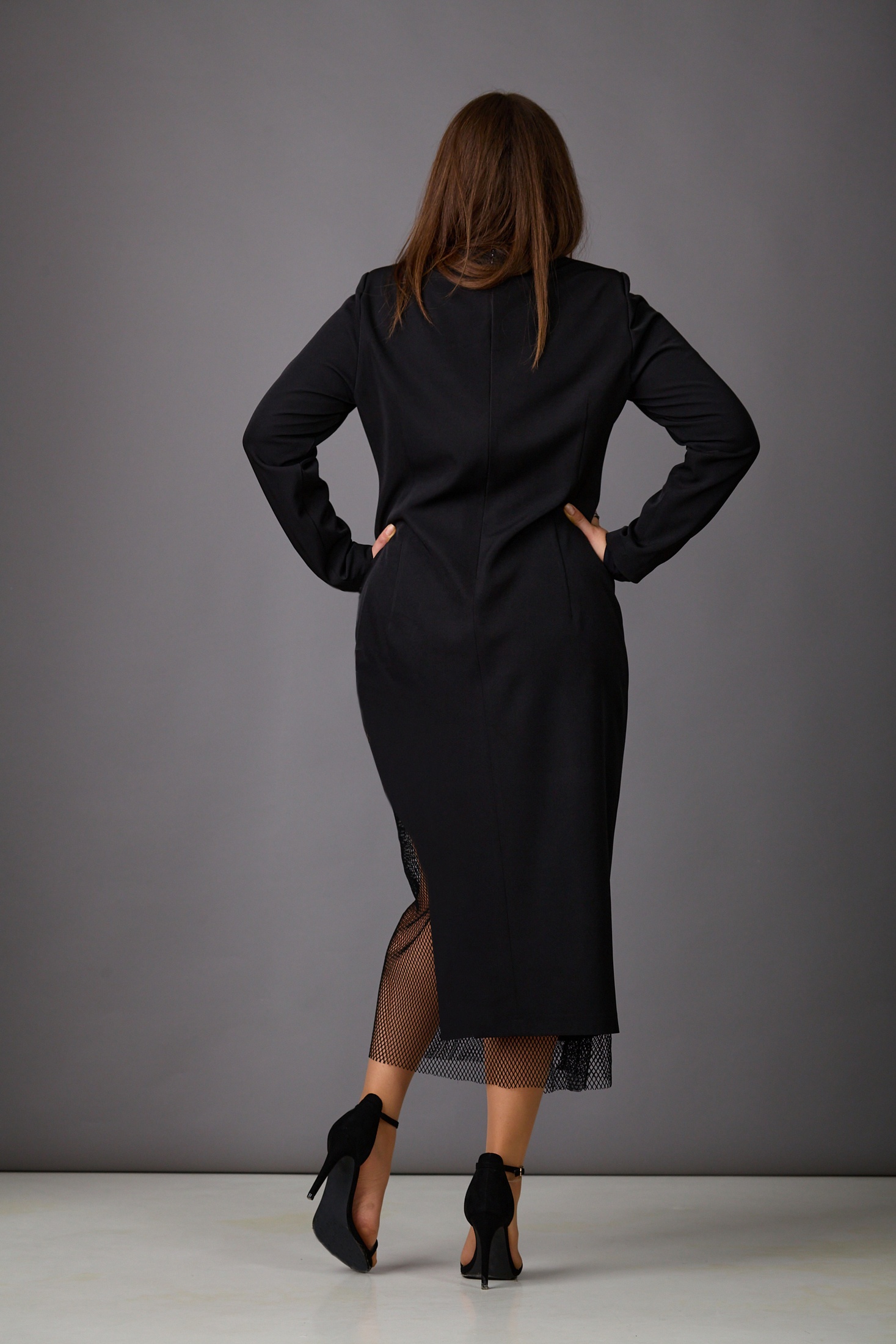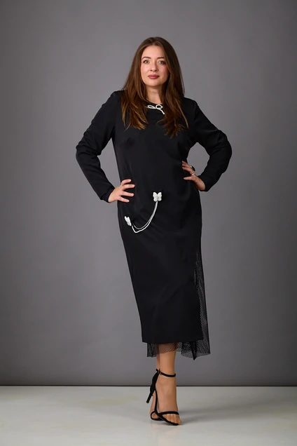 Роскошный комплект из стрейчевой костюмной ткани и сетки. Состоит из туники и юбки. Асимметричная туника с вытачками по переду и спинке. Рукава втачные, длинные. Туника застегивается на молнию в среднем шве спинки. Декорирована брошью и бантиком. Нижняя юбка из сетки. Юбка со сборкой по линии талии и поясом-резинкой.