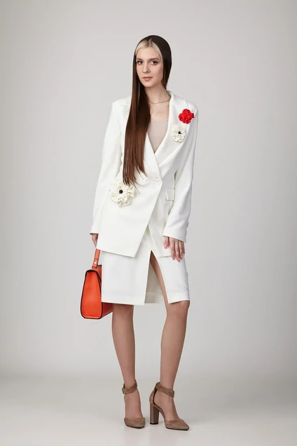 Комплект, состоящий из жакета и юбки из костюмной ткани на подкладке. Двубортный жакет полуприталенного силуэта с отрезными бочками и вытачками по переду и спинке. Воротник-с отложными лацканами пиджачного типа. По переду - прорезные карманы с клапанами. Рукава длинные, двухшовные. Жакет застегивается на две пуговицы. Жакет декорирован цветами-брошами ручной работы. Юбка прямая с наклонными карманами и разрезом по переду , с широким поясом-обтачкой. Застегиваются на молнию сзади. Цвет молочный.
