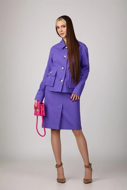 Комплект женский на подкладке из джинсовой ткани. Жакет прямого силуэта, по переду нагрудные вытачки и объемные карманы-портфели с клапанами. Пройма спущена, рукава узкие. Воротник с притачной стойкой. Застегивается на 4 пуговицы. Юбка прямая с наклонными карманами и складкой по переду , с широким поясом-обтачкой. Застегиваются на молнию сзади. Цвет розовый.