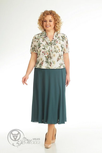 Юбка из однотонного плательного крепа на подкладке из шифона, покроя "по косой".Пояс на резинке. Блуза из шифона , на шифоновой подкладке с мягким воротником-шарфом. Состав: Блуза -п/э 100%; Юбка : вискоза 65%, пэ 30%, эластан 5% Длина блузы по спинке р.50,52 - 58,5 см, р.54,56 - 59,5 см Длина рукава р.50,52 - 23 см, р.54,56 - 24 см. Ширина рукава под проймой 1/2 р.50 - 19см, р.52 - 20 см, р.54 - 21 см, р.56 - 22 см Ширина юбки по верху 1/2 р.50 - 38 см. р.52 - 40 см. р.54 - 42 см, р.56 - 44 см Длина юбки по спинке р.50,52,54,56 - 81 см