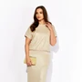 Комплект женский, 2х предметный, состоящий из блузы и юбки. Блуза прямого силуэта, с коротким цельнокроеным рукавом, снизу на манжете. Вырез горловины круглой формы. По низу рукавов и горловине подрезные бейки. Юбка прямая. Сзади средний шов и подрез снизу. Пояс на резинке(по переду отрезной, по спинке цельнокроеный) Перед блузы и юбки выполнен из фактурного полотна , спинка блузы и юбки из гладкого трикотажного полотна. По переду блузы и юбки трикотажная подкладка.