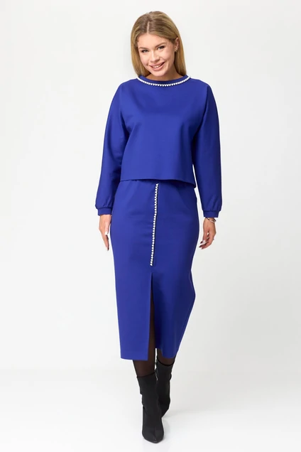 Комплект трикотажный «Королевский» состоит из укороченного джемпера и соблазнительной юбки. Украшен декоративным жемчугом.