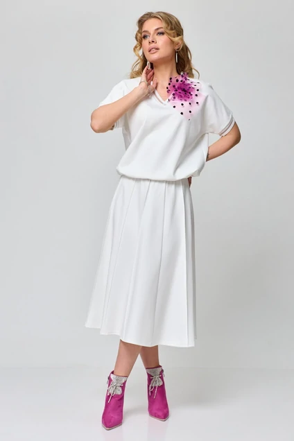 Весенний трикотажный комплект состоит из укороченного джемпера и юбки «шестиклинки» в натуральном молочном цвете с ярким декоративным цветком.