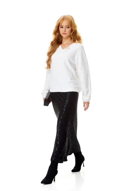 Элегантный комплект состоит из мягкого пушистого джемпера из ангоры и черной леопардовой юбки-midi полуприлегающего силуэта.