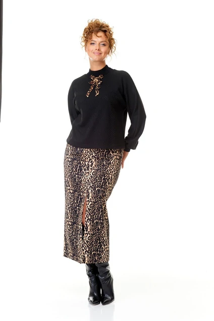 Стильный молодежный комплект состоит из леопардовых юбки и трикотажного джемпера с дизайнерской брошью.
