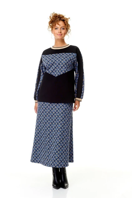 Универсальный трикотажный комплект состоит из джемпера и юбки, выполнен из комбинированного трикотажа.