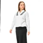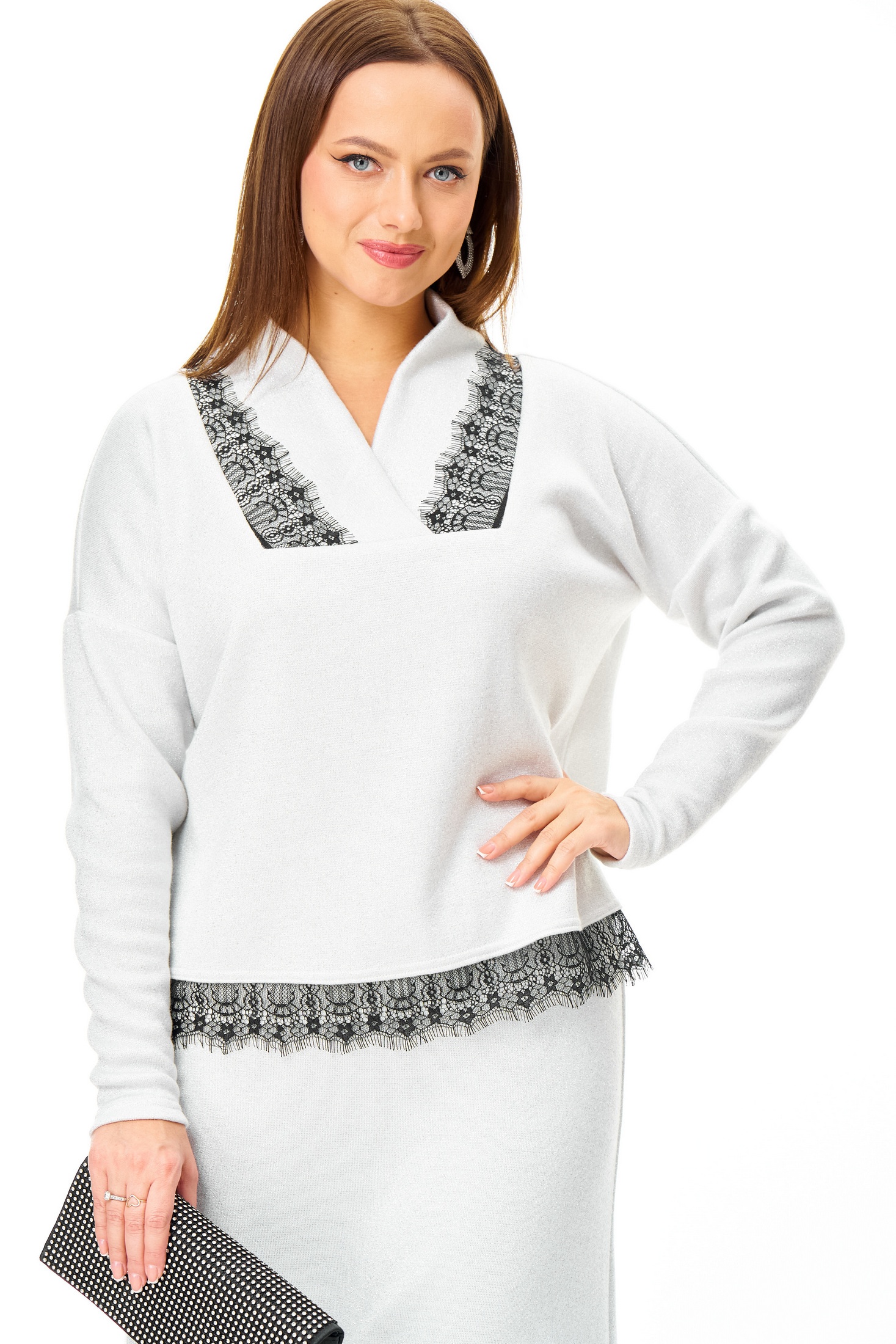 Уютный джемпер свободного силуэта. Воротник с глубоким запахом переходит в планку на груди. Рукав зауженный длинный. Воротник и низ переда с кружевной отделкой.