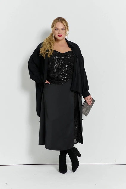 Юбка с расширением к низу, на поясе с резинкой и застёжкой на молнию сбоку. На переднем полотнище разрез от пояса, открывающий подкладку из нарядной декоративной ткани. Изделие на подкладке.