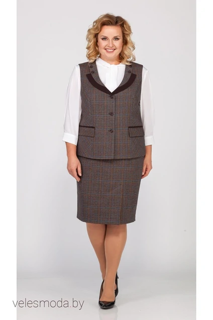 Офисный комплект юбка и жилет. Жилет полуприлегающего силуэта из костюмного клетчатого полотна с застежкой на 3 пуговицы по борту. Горловина без воротника декорирована округлыми лацканами с однотонной отделкой закрепленной пуговицами. Классические прорезные карманы с клапаном акцентированы однотоном. Юбка-карандаш на обтачке по талии с вертикальным рельефным швом, по переду шлица. На подкладке. Два дизайна выставляйте. Длина жилета 57 см, юбки 61 см.