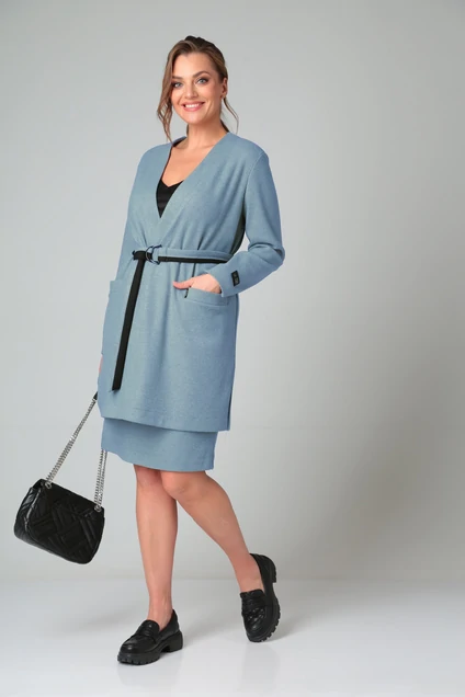 Комплект состоит из кардигана и юбки, выполнен из трикотажного полотна.