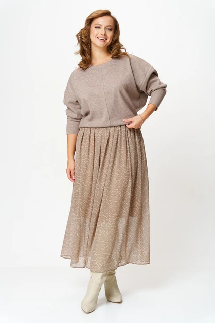 Комплект женский состоит из джемпера и юбки. Джемпер трикотажный свободного покроя типа летучая мышь. По переду и спинке по центру вертикальный декоративный защип, который визуально вытягивает фигуру. Горловина округлой формы, обработана планкой из основной ткани. Юбка миди из шифона с принтом в мелкий горошек. Пояс на резинке. Юбка на подкладке.