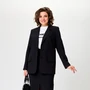 Жакет выполнен на контрастной подкладке из поливискозы. Жакет прямого силуэта, с центральной застежкой на две петли и 2 пуговицы. Перед жакета с нагрудными вытачками и прорезными карманами с листочками в области бедер. В области груди обработан прорезной карман с листочками, с декоративной патой, застегивающийся на петлю и пуговицу. Спинка жакета со средним швом, по низу которого обработана шлица до линии талии. Рукава двухшовные втачные. Горловина оформлена воротником пиджачного типа.