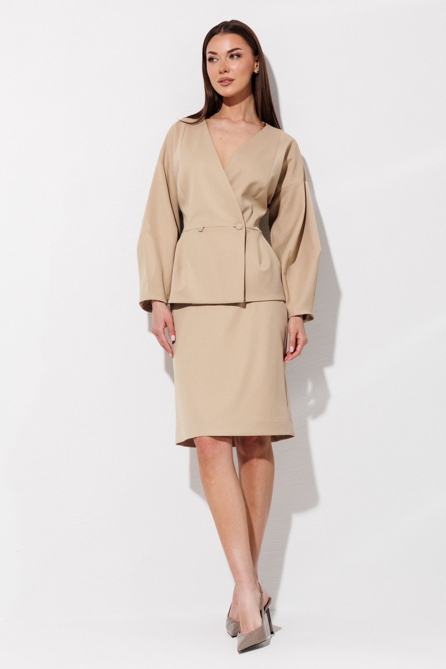 Костюм с юбкой 1115 бежевый V&N fashion очарует вас своим изящным приталенным силуэтом. Коллекция бренда V&N fashion представлена сочетанием полиэстера, вискозы и спандекса, что делает материал мягким и эластичным. Двухбортный жакет с декоративной застежкой петли-пуговицы и спущенным рукавом-фонарем добавляет стиль и класс к вашему образу. Юбка миди с потайной застежкой на молнии и разрезом сзади обеспечивает удобство и комфорт. Этот бежевый костюм идеально подходит для офиса или деловых встреч в сезоны весны и осени.
