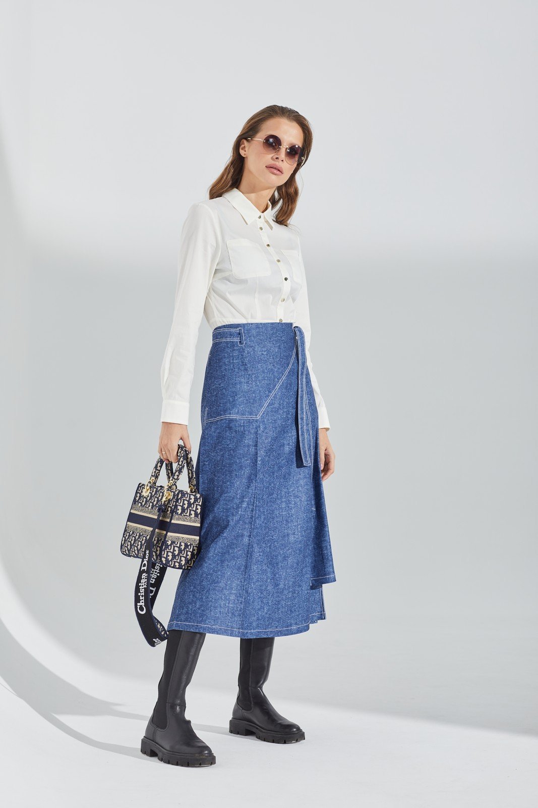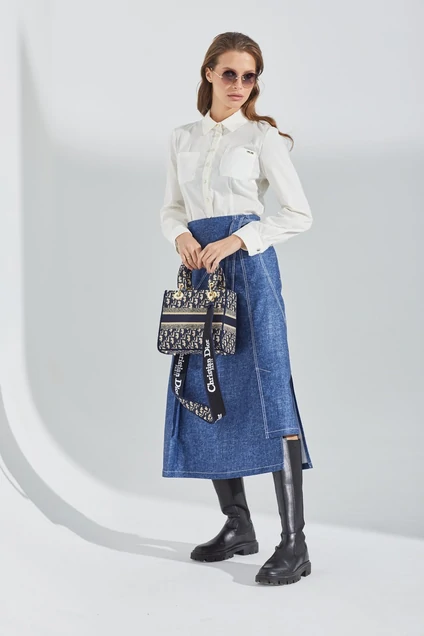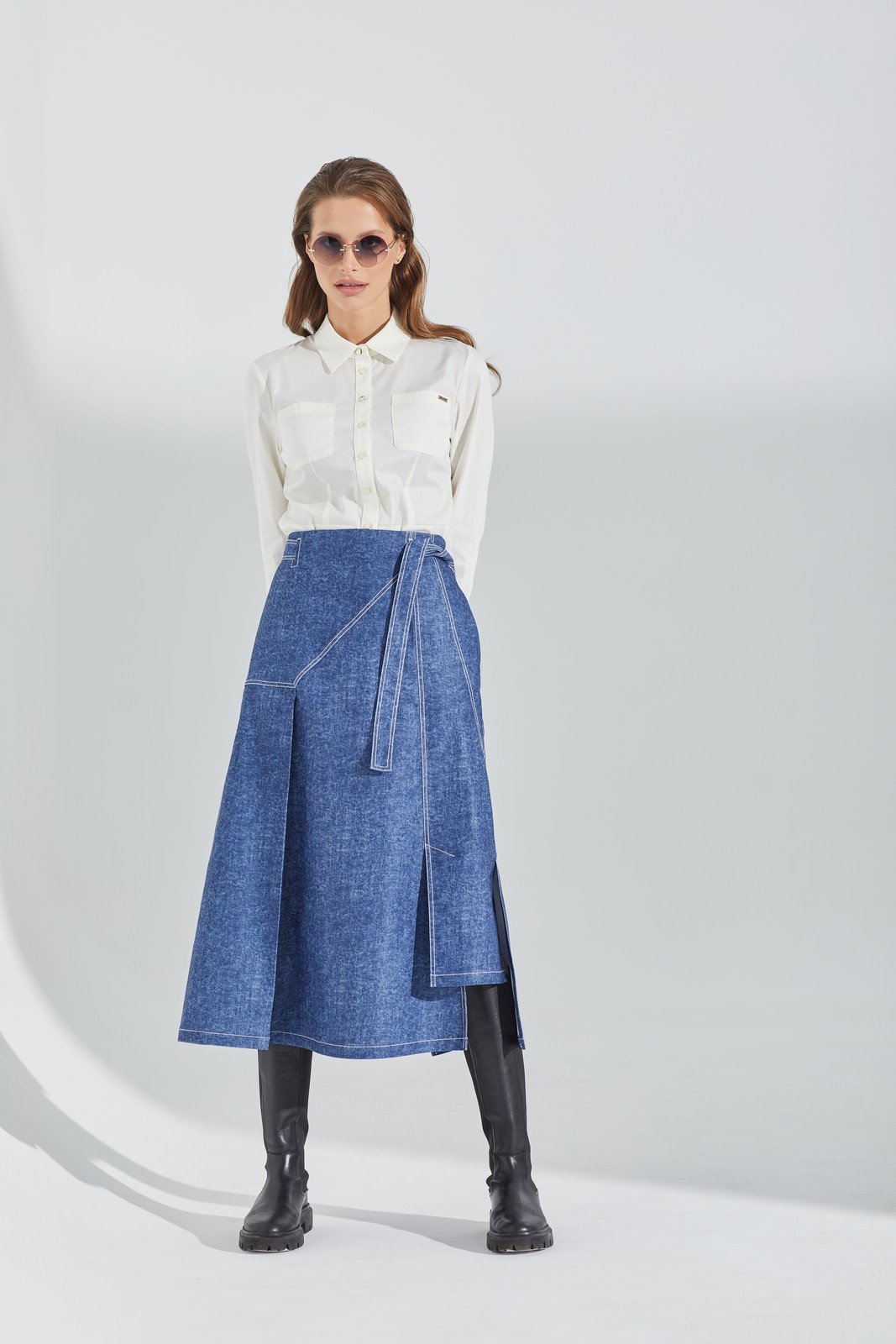 Юбка А-образного силуэта из хлопковой джинсовой ткани, длина макси, разно уровневая линия низа, по переду, боку и задней части шлицы,