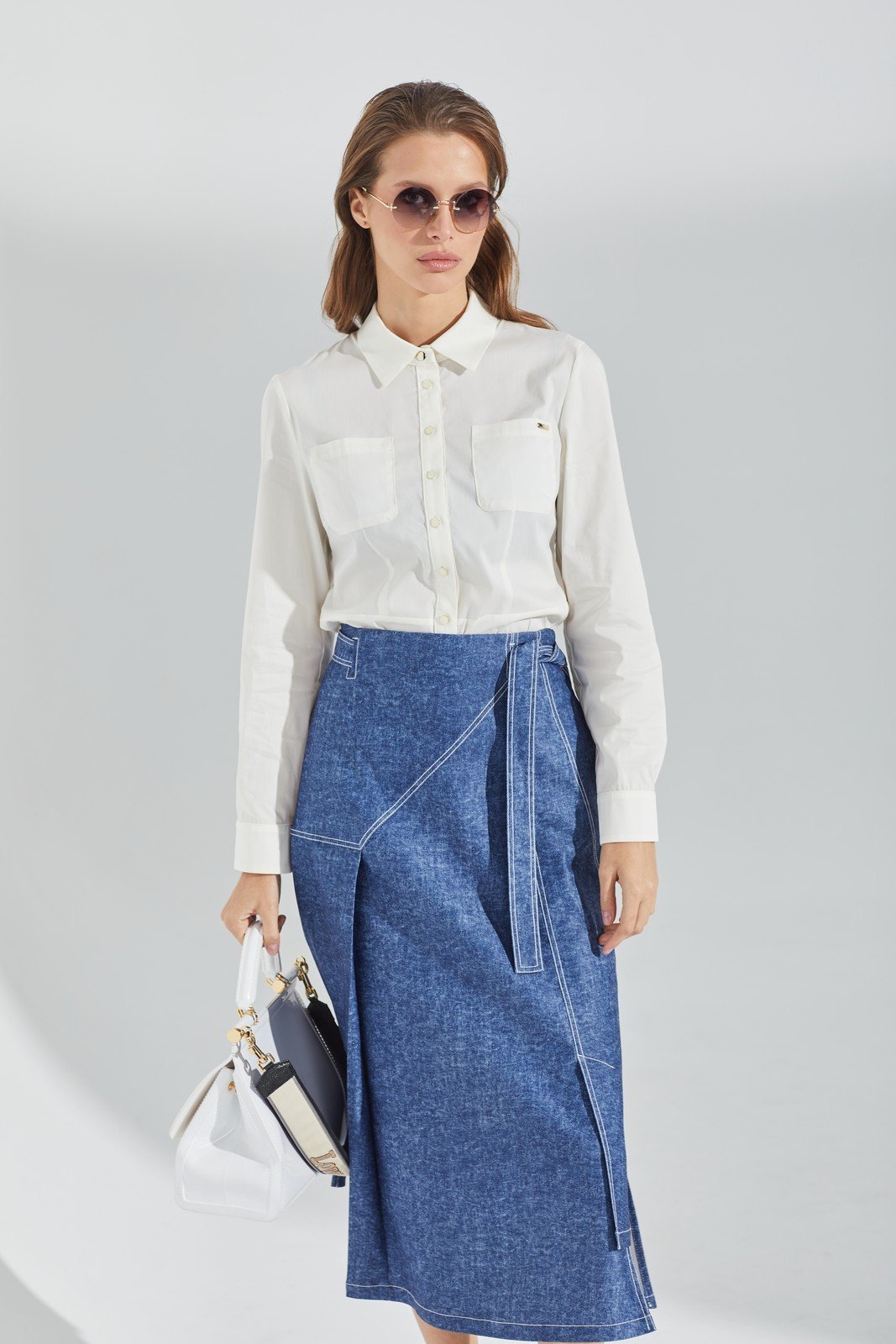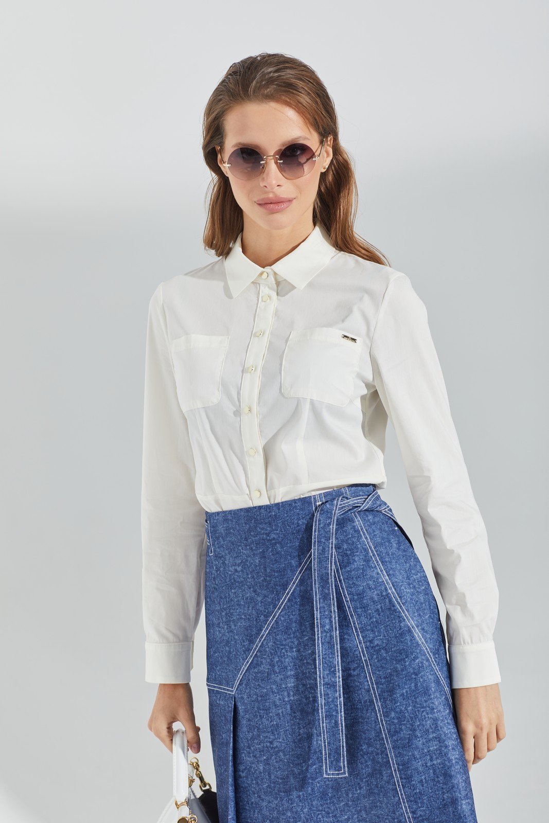 Комплект 2-х предметный.Блузка полуприлегающего силуэта, отрезная по линии талии, из хлопковой ткани. Перед на планке, застёжка на петли и пуговицы, накладные карманы, талиевые и нагрудные вытачки. Воротник стояче-отложной. Рукав длинный, втачной на манжете на петлю и пуговицу.