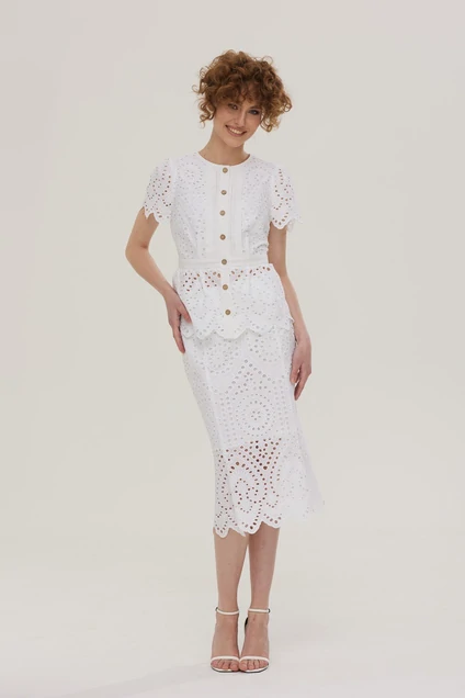 Костюм из хлопковой ткани «шитье». Блузка прилегающего силуэта. Застежка по переду на петли и пуговицы. Горловина круглой формы. Блузка отрезная по талии. Нижняя часть со сборкой. Рукава короткие со складками