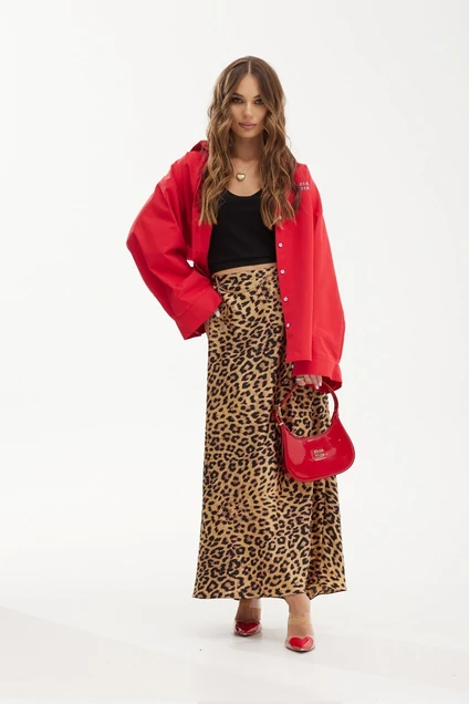Комплект 3-х предметный: блузка, топ и юбка.Блузка из хлопковой ткани свободного кроя. Застежка по переду на кнопки. Воротник рубашечный. На переде карманы. Рукав широкий с манжетой понизу. Застежка манжеты на кнопку.Топ без рукавов из трикотажного полотна. Топ прилегающего силуэта. Вырез горловины круглой формы. По низу изделия эластичная тесьма.Юбка макси из атласной ткани. Верх на поясе. Застежка в левом боковом шве на потайную молнию. В комплекте съемный пояс-цепочка.