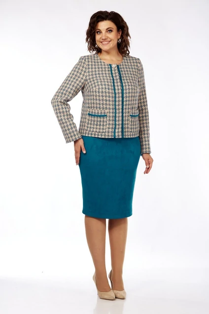 Костюм женский, состоит из жакета и юбки. Жакет прямого силуэта на подкладке, с естественной линией плеча.Центральная однобортная застёжка на потайные кнопки.Вырез горловины округлой формы.Спинка со средним швом.Перед декоративной планкой с кантами.На полочках накладные карманы.Рукав втачной двухшовный с разрезами в локтевом шве.Низ рукава обработан отделочной тканью.Юбка зауженного силуэта.В среднем шве заднего полотнища застежка на потайную тесьму-молнию и шлица.Пояс притачной с резинкой в боковых швах.