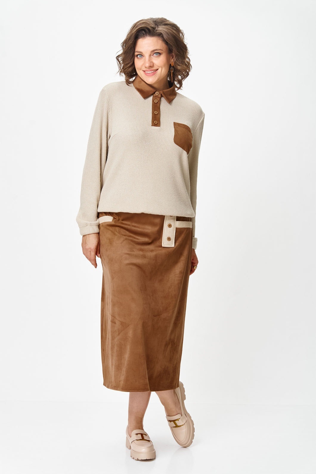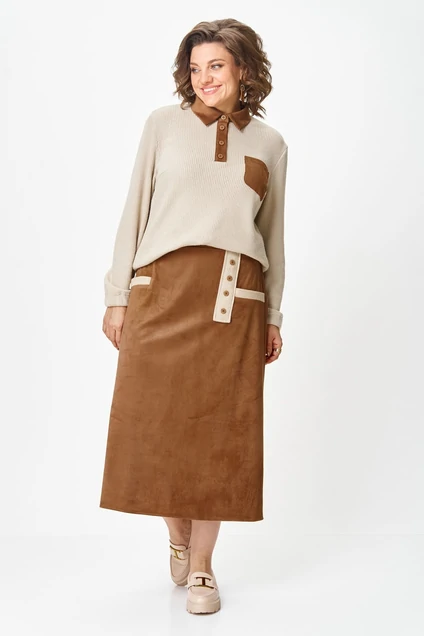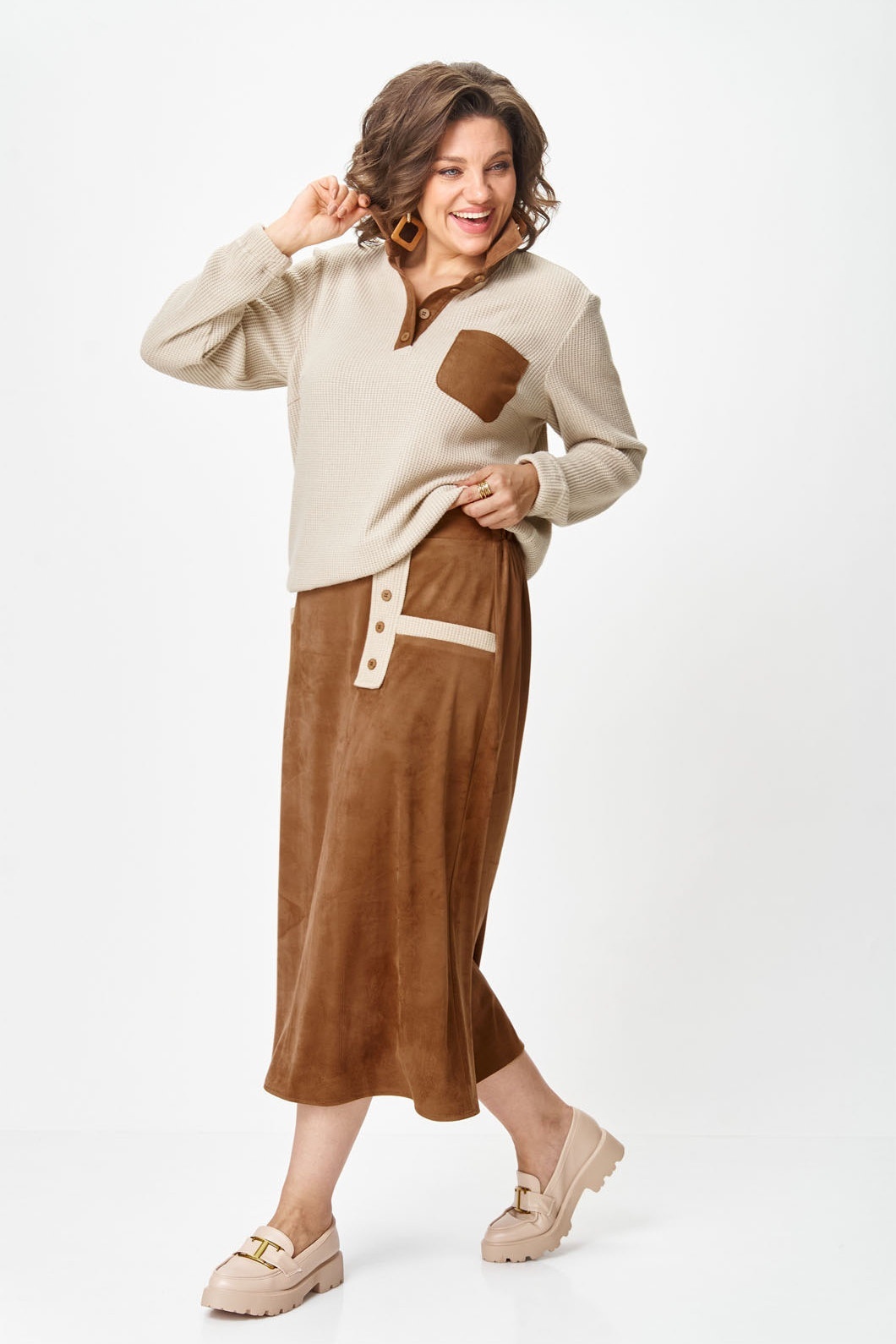 Костюм с юбкой 672 Via-mod — это стильный выбор для современной женщины. Коллекция бренда Via-mod предлагает комплект блуза и юбка, который отличается изысканным сочетанием материалов: блуза выполнена из вязаной трикотажной ткани с добавлением вискозы, нейлона и спандекса, имитируя замшу, а юбка из полиэстера и хлопка с эластаном. Фасон свободного силуэта подчеркивает комфорт и свободу, а детали, такие как нагрудные выточки, накладной карман и планка с пуговицами, добавляют изюминку. Цветовая палитра играет на бежево-коричневых тонах, делая комплект идеальным для офиса и городских прогулок. Наличие резинки на поясе юбки и по низу блузы обеспечивает отличную посадку. Идеален для весны и осени.