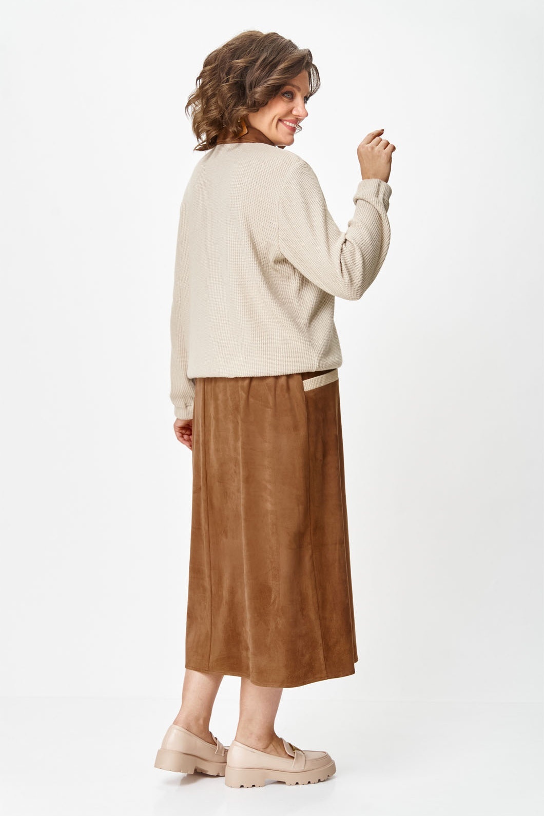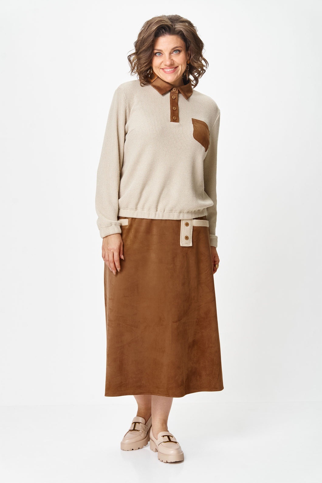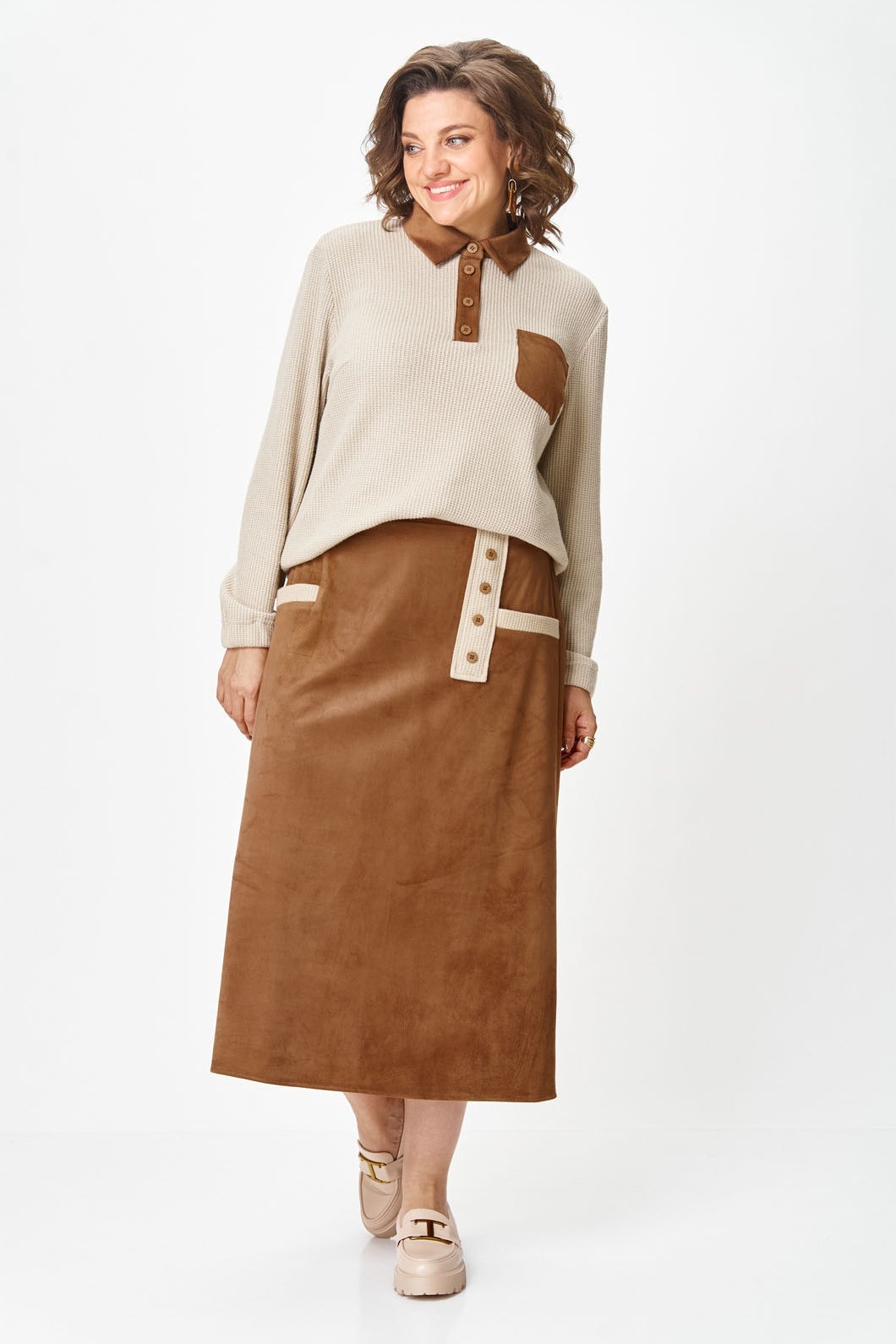 Костюм с юбкой 672 Via-mod — это стильный выбор для современной женщины. Коллекция бренда Via-mod предлагает комплект блуза и юбка, который отличается изысканным сочетанием материалов: блуза выполнена из вязаной трикотажной ткани с добавлением вискозы, нейлона и спандекса, имитируя замшу, а юбка из полиэстера и хлопка с эластаном. Фасон свободного силуэта подчеркивает комфорт и свободу, а детали, такие как нагрудные выточки, накладной карман и планка с пуговицами, добавляют изюминку. Цветовая палитра играет на бежево-коричневых тонах, делая комплект идеальным для офиса и городских прогулок. Наличие резинки на поясе юбки и по низу блузы обеспечивает отличную посадку. Идеален для весны и осени.