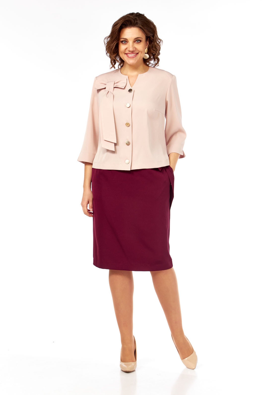 Костюм с юбкой 678 Via-mod — это стильный выбор для офиса или деловых встреч. Коллекция бренда Via-mod предлагает комплект из жакета и юбки свободного силуэта, выполненный из полиэстера с вискозой и эластаном, что обеспечивает комфорт и свободу движений. Жакет украшен бантом и застёгивается на пуговицы, имеет небольшой разрез на манжете и настроченный элемент — бант. Юбка на подкладке оснащена карманами и молнией на спинке. Верхний срез юбки обработан поясом с резинкой для удобства. Нежные кремовые и винные тона идеально подходят для осенне-весеннего сезона. Этот костюм идеально комбинируется с обувью на каблуке, подчеркивая женственность и стиль.