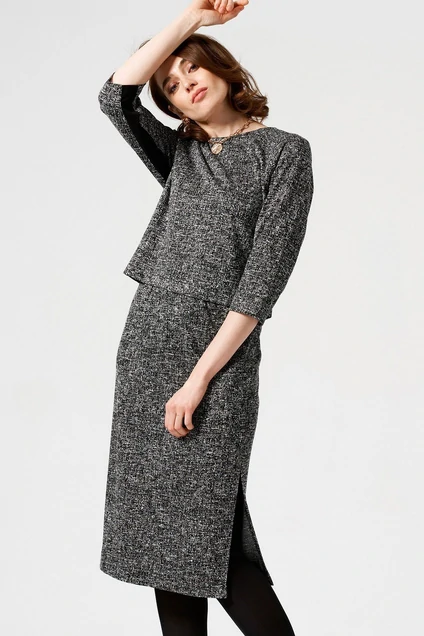 Комплект женский. Состоит из джемпера и юбки. Джемпер женский, прямого силуэта. Выполнен из высококачественного трикотажа. Горловина округлой формы. Рукав втачной ¾. Спинка с средним швом, в который втачена потайная тесьма молния.