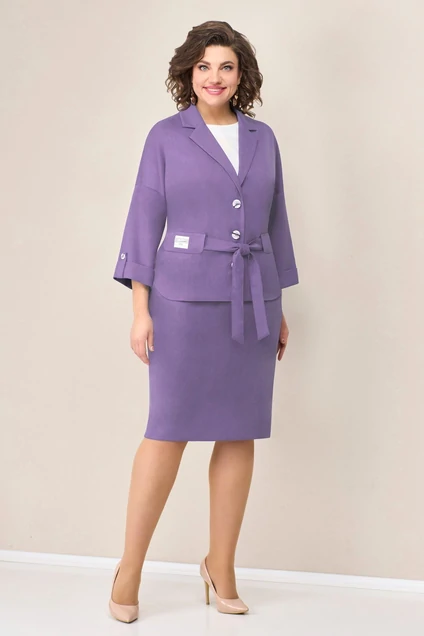 Костюм-тройка из легкого текстиля. Комфортный жакет с застежкой на пуговицы, без подкладки, с цельнокроеным рукавом и съемным поясом. Длина жакета по центру спинки- 62см. Юбка прямая, классическая, со шлицей. Пояс юбки притачной со вставками с резинкой. Длина юбки- 62см манжетой. Блуза из легкого текстиля с фигурным низом и спущенным коротким рукавом. Длина блузы по центру спинки- 58см.